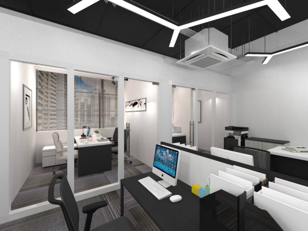 Description: A sophisticated modern office by Tan Seng Renovation showcases sleek black furniture, white walls, and expansive windows. Lush plants and curated abstract art by Jeff and Jason Tan enhance the elegant atmosphere.