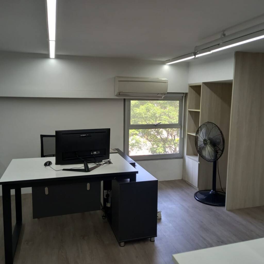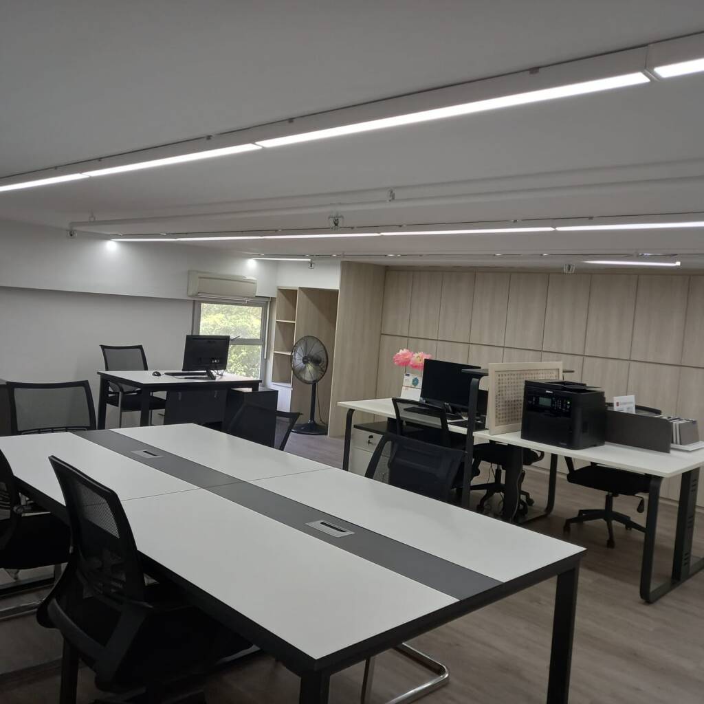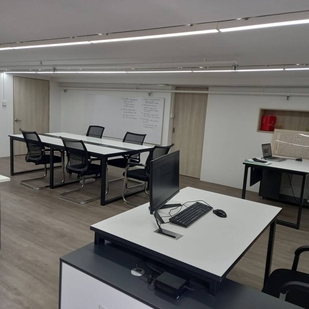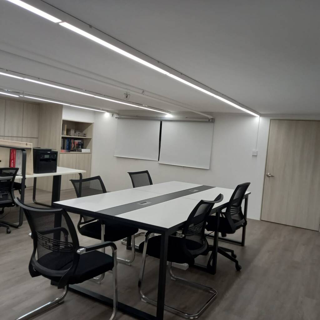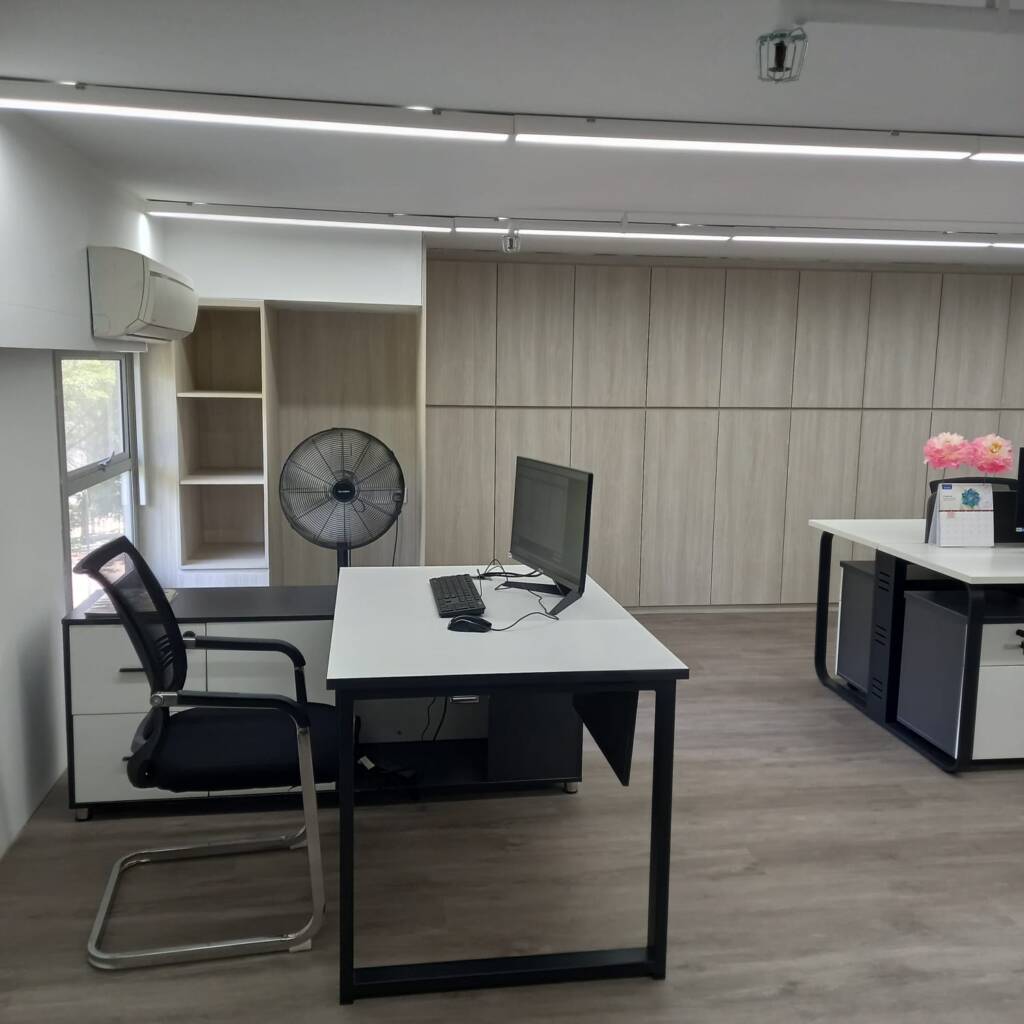 Description: A professional office designed by Tan Seng Renovation features warm wood tones throughout. Rich wood furniture complements soft beige walls, while large windows invite natural light, creating a cozy yet elegant workspace.